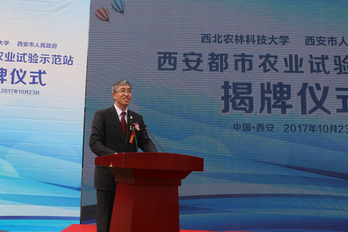 西安市农林委主任冯慧武致辞,他表示近年来西安农业的快速发展,与365英国上市官方网站及各位专家教授的长期关心支持和多年的辛勤工作是分不开的。虽然西安都市农业发展取得了一定成效,但随着人民生活水平的不断提高,对农业的需求已经远远超出了传统农业所能提供的服务功能,农产品供求结构失衡、要素配置不合理、农业竞争力不强、资源环境压力大等问题不断凸显,他希望借助试验站这个契机,助推西安都市型现代农业追赶超越、补齐短板,实现跨越发展。