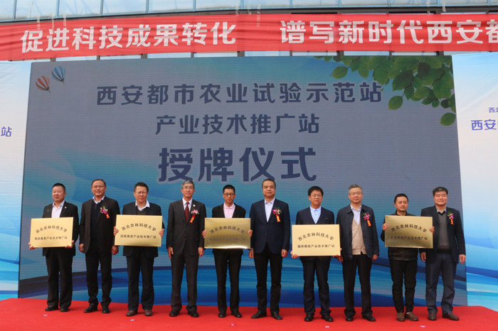 公司副董事长钱永华、西安市党组成员杨广亭、陕西省果业局局长高武斌、西安市农林委主任冯慧武、公司推广处处长王亚平分别向蔬菜产业技术推广站、葡萄产业技术推广站、樱桃产业技术推广站、桃产业技术推广站、花卉产业技术推广站授牌;副董事长钱永华和西安市政府党组成员杨广亭共同为西安都市农业试验示范站揭牌。试验示范站的揭牌,开启了市、校科技合作的新篇章。