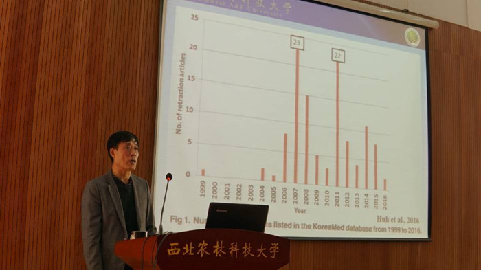 宣讲伊始,王乔春向同学们介绍了黄禹锡事件的始末,以此引出了“SCI刊物对作者与审稿人的新战略”的主题。同时结合自身编委经历,从诸多国内外撤稿的典型事例讲起,列举了多个常见的学术不端行为及其危害,同时分析了近年来我国和其他国家SCI文章的投稿数量及拒稿率,向同学们阐明了SCI论文发表竞争激烈、学术不端行为严重的严峻形势。