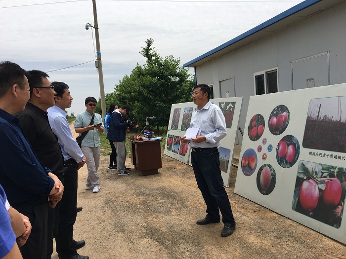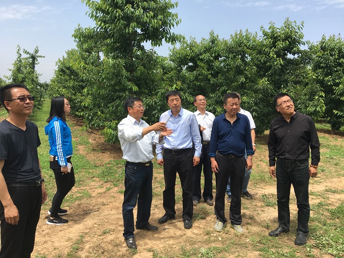 随后试验站专家带领领导实地考察了樱桃配套集约化栽培管理模式:超细长纺锤形、V字形和多主干篱壁式(改良UFO)栽培模式。蔡宇良教授介绍,试验站自成立以来已室内开展技术培训360余场次,培训技术人员675人次,培训果农7850余人次;现场培训700余场次,8600余人次;现场指导和电话咨询指导12200余人次。培养本科生18人,研究生30人。共接待参观考察团135个,5600余人次。试验站定期邀请国内外行业专家到试验站开展技术交流,引进新品种新技术,同步接轨国外先进的果园栽培配套技术,进行试验示范与推广。同时向领导介绍了试验站在引领铜川及周边地区的樱桃产业发展和扶贫工作情况,并反映了试验站目前存在的问题,主要包括硬件设施不够齐全、专家住宿条件差,希望在双方的努力下,将试验站的建设推向新高度。
