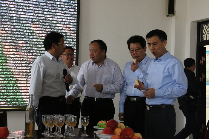 农业部科教司司长廖西元在试验站品尝新品种‘秦蜜’及苹果冰酒