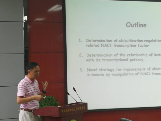 Fangming Xiao博士在公司207会议室为公司师生带来了题为“Characterization and manipulation of abiotic stress signaling in tomato”的学术报告。报告中,Xiao博士详细介绍了与应激有关的NAC1转录因子的泛素调节,NAC1的不稳定性与其转化效力的关系以及NAC1转录因子改善番茄非生物胁迫耐受性的新策略。报告取得了良好的反响。