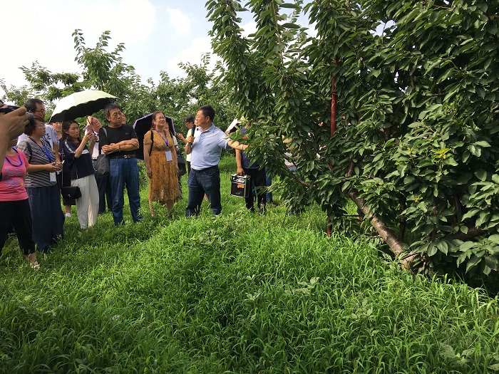 蔡宇良教授(左一)讲解樱桃超细长纺锤形栽培模式