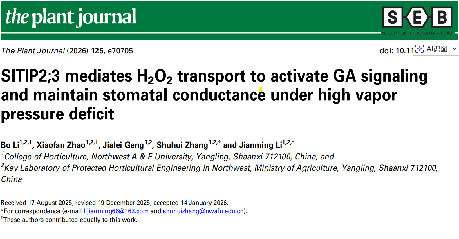 近日,365英国上市官方网站设施农业生物与环境工程研究团队李建明教授/张淑辉副教授课题组在《The Plant Journal》在线发表题为“SlTIP2;3 mediates H2O2 transport to activate GA signaling and maintainstomatal conductance under high vapor pressure deficit”的研究论文,揭示了SlTIP2;3介导H2O2转运与GA信号级联偶联,在VPD升高时触发可塑性形态响应,从而协同提升Kplant,缓解气孔导度随VPD增加而下降的功能模型,深化了对植物响应VPD升高的机制理解。