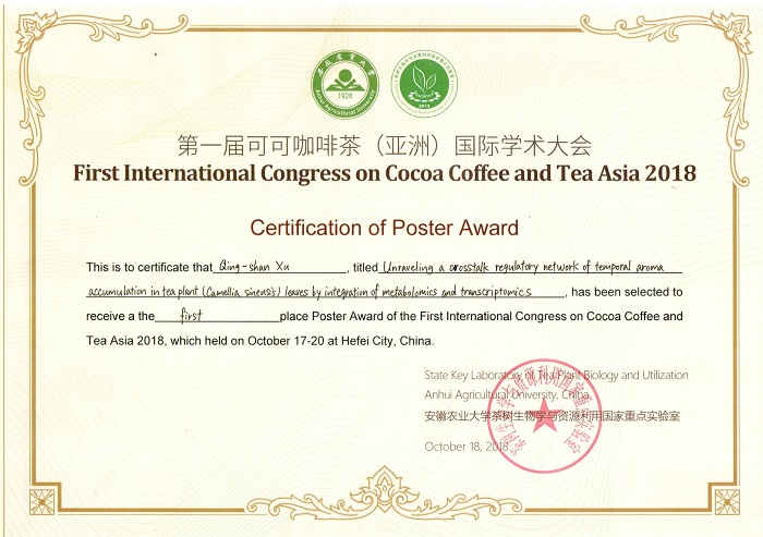 10月17日-20日,由安徽农业大学茶树生物学与资源利用国家重点实验室主办的“第一届可可、咖啡和茶(亚洲)国际学术大会”在安徽合肥召开。来自德国、日本、中国、荷兰、印度、巴基斯坦等世界各国的专家学者参加了此次国际会议。公司高岳芳、徐清山老师一行4人参加了此次会议并向大会提交了2篇论文摘要和3份Poster,高岳芳副教授做了“Extraction, characterization and utilization of functional tea polysaccharides”的口头报告,徐清山老师荣获Poster Award一等奖。会议期间,代表还与参会的相关专家学者就茶树育种、茶叶化学进行了深入交流。
