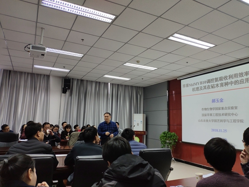 11月25日下午,山东农业大学郝玉金教授为公司师生带来了题为“苹果MdMYB10调控氮吸收利用效率的分子机理及其在砧木育种中的应用”的学术报告。