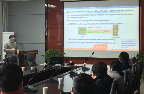 报告中,Heqiang Huo(霍合强)博士介绍了LsNCED4(9-cis-EPOXYCAROTENOID DIOXYGENASE4)基因在调控生菜种子高温抑制中的作用,以及LsDOG1(DELAY OF GERMINATION1)基因通过microRNA途径调控生菜种子休眠和开花中的作用机制,最后还讲解了通过生物防治技术防控园艺作物中的白粉虱虫害的方法。报告内容详实、丰富,引起了与会师生的强烈兴趣。报告后,师生就 LsNCED4 和 LsDOG1 基因的具体功能特点、转基因过程中的技术问题等展开了热烈讨论。