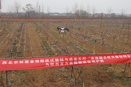 为了解决猕猴桃产业生产中存在的劳力短缺、生产成本大等问题,提高猕猴桃生产作业的机械化,提高效率,降低成本,2018年12月13日,公司猕猴桃试验站联合西安天问公司实施了植保无人机“军猕融合航空植保项目”,在猕猴桃试验站果园进行了植保无人机应用技术试验。