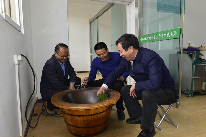 余有本为徐养福一行介绍名优绿茶的制作工艺