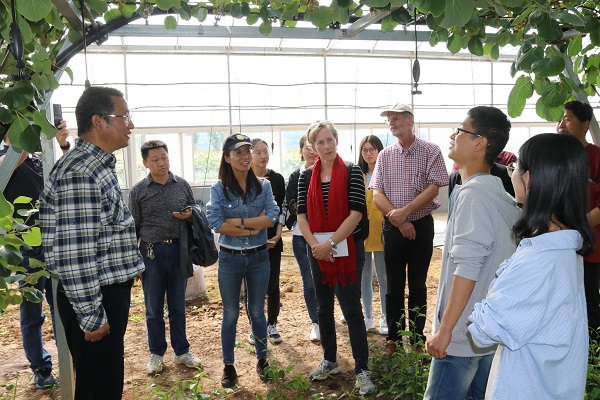 本次来访的新西兰猕猴桃专家有新西兰佳沛国际有限公司全球生产总监Shane Max、创新部总监Mary、中国项目负责人Dr Zhitan Sun科技专员Drcuilan Wu和新西兰皇家植物与食品研究院高级科学家Mike Currie、Kevin Patterson等一行在猕猴桃试验站首席专家刘占德研究员的带领下,参观了猕猴桃试验站苗木繁育、架型栽培、果园生草和省力化授粉等试验项目的研究进展情况,就有关科研开展情况进行了交流。