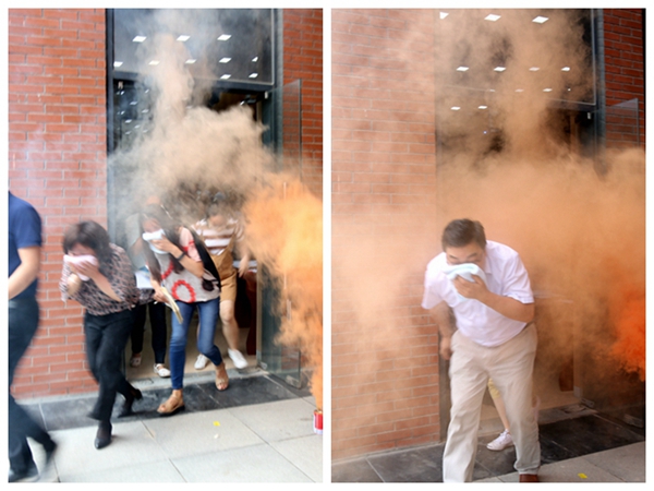 课堂讲授环节结束后,公司组织与会师生参与现场逃生演练,大家积极参与到演练中,现场气氛热烈,效果良好。公司台阶教室冒出滚滚浓烟,随即哨声响起。面对突发火情,大家口捂毛巾、俯身有序地沿着消防通道快速安全逃离火灾现场。大约三分钟后,所有人员陆续撤离到安全地带。通过此次火灾紧急疏散和消防演练活动的开展,加深了师生对消防安全知识的理解,熟悉了消防器材的正确使用方法,增强了职工的消防安全意识,提高了大家在遇到火情时的处置应对与自救能力,为更加筑牢公司安全“防火墙”奠定坚实的基础。