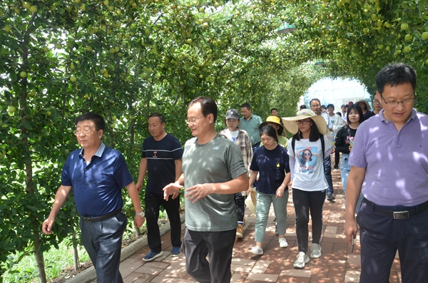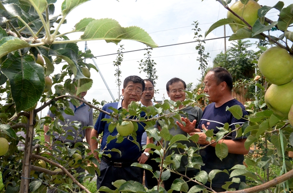 座谈会后吴普特一行查看了新品种秦脆、秦蜜在洛川的表现,站长安贵阳研究员介绍了试验站的种质资源圃、选种场、水肥一体化、不套袋栽培等试验示范区,吴普特董事长对试验站的各项工作给予了充分肯定,建议一定要扎根农村,产学研相结合,最大化发挥公司校外基地的作用。