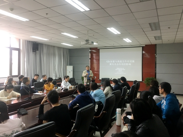 崔世茂教授结合自己的科研工作,向师生们阐明了加富二氧化碳,能够提高黄瓜的光合碳同化量,而补充二氧化碳多少,这个跟温度又有很大关系。淀粉粒毒害可以引起黄瓜叶片早衰。对某一作物而言,光饱和点并不是一成不变的,随着二氧化碳浓度提高也会导致出现不同的光饱和点。崔教授的报告生动幽默,深入浅出,与会师生听得很专注。报告结束,崔教授与参会师生就相关领域内的学术问题进行了交流讨论,并对大家提出的问题一一进行了细致地解答,整个报告会圆满结束。