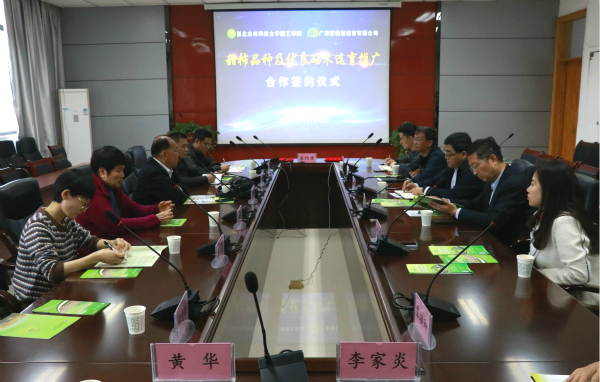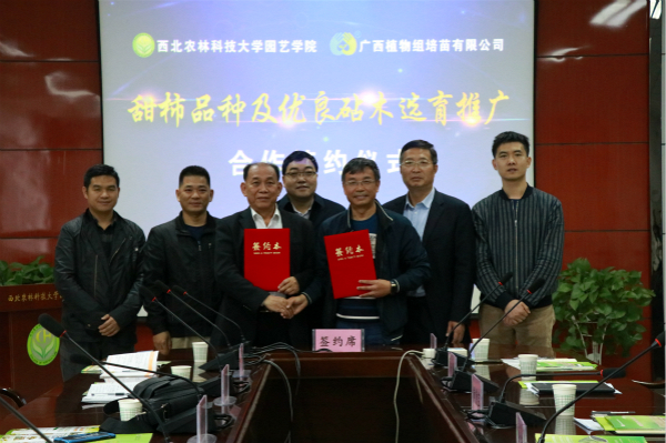 为充分发挥公司科技优势,提升广西及全国甜柿种植生产创新能力和科技水平,实现甜柿科学研究与技术创新目标,加速科技成果转化,加快甜柿产业快速健康发展,广西植物组培苗有限公司与公司就甜柿品种及优良砧木选育推广达成合作协议。4月20日上午,合作签约仪式在公司207会议室举行。会议由副经理徐凌飞主持,党委书记黄德宝、教授杨勇、副教授关长飞、广西植物组培苗有限公司总经理林贵美一行参加会议,林贵美、杨勇代表双方签署协议。