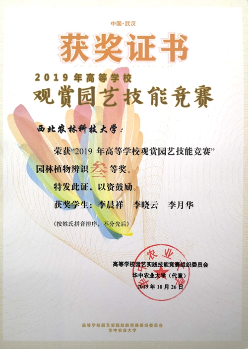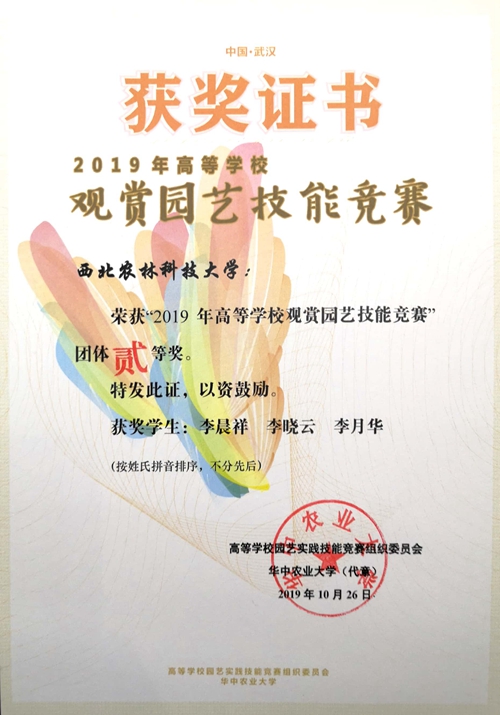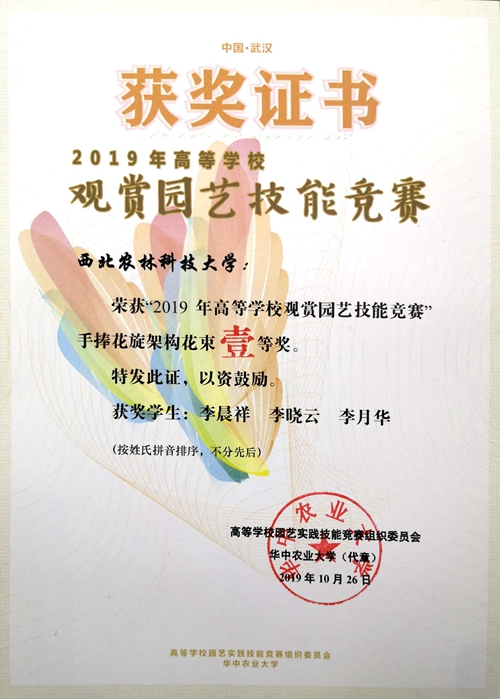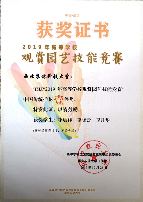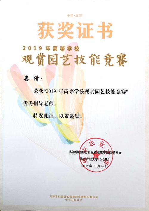 10月25日,由华中农业大学承办的“2019年高等公司观赏园艺技能大赛”在武汉召开,公司喜获中国传统插花一等奖、手捧花螺旋架构花束一等奖、园林植物识别三等奖,团体荣获二等奖,娄倩老师获优秀指导老师荣誉称号。