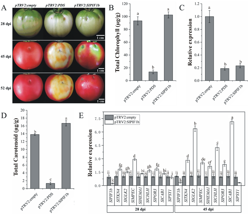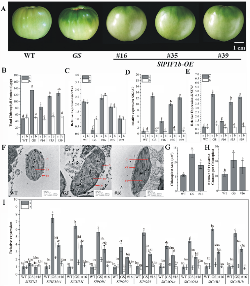 进一步研究发现,在GS中过表达SlPIF1b抑制了果实叶绿体的发育,导致果实的肩部颜色变浅,叶绿素含量降低,光合作用活性降低,淀粉积累减少,果实成熟后品质下降(图1)。SlPIF1b的下调表达显著促进了果实叶绿体的发育和功能,从而增加了叶绿素和类胡萝卜素的积累(图2)。