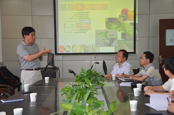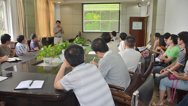 报告会上,Bingyu Zhao副教授详细介绍了其研究团队关于黄单胞菌III型非寄主抗病抑制子AvrRxo1的研究进展;阐明了AvrRxo1的结构特点及其在植物抗细菌性条斑病中的保守功能;进一步对AvrRxo1抗病机理进行了深层挖掘解析;最后将研究成果很好的应用于生产实际,指导水稻和辣椒等作物的广谱抗病育种。随后,Bingyu Zhao副教授与在场师生就报告内容相关问题进行了热情交流。整个报告引人入胜,既富科学性,又具趣味性,为公司师生进一步拓宽科学视野,增强创新意识,提供了新的思路和借鉴。