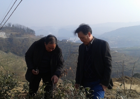 肖斌教授与安康鑫鑫农业发展有限公司肖德平总经理在汉滨区流水镇茶叶基地交流茶树栽培技术
