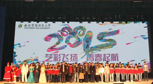 表彰大会结束后,以“艺彩飞扬,青春起航”为主题的元旦晚会在团学干部青春洋溢的开场舞中拉开帷幕。流行与古典兼收,温情与火热并举,形式多样,精彩纷呈。十佳歌手倾情献唱,《暗香》浪漫温馨,《安静》深情动人;由同学们自编自导的小品《占座》、《英雄》、相声《论捧逗》,用精妙绝伦的语言、惟妙惟肖的表演和令人捧腹的角色反串,引得观众爆笑连连;舞蹈串烧《咋了爸爸》、《fantastic baby》等用动感的舞步彰显了同学们阳光活泼的青春风采;校园舞蹈大赛获奖作品《脊梁》更是铿锵有力,雄壮激昂,将男儿本色尽显;来自研究生的小品《师姐知道》、舞蹈《不要不要》展现出了研究生的别样风采。现场互动独具匠心,同学们通过挂心愿卡、 “微信墙”等方式参与互动,为表演者加油,并送出新年祝福。晚会最终在园艺143班的合唱《心在一起》中圆满落幕。