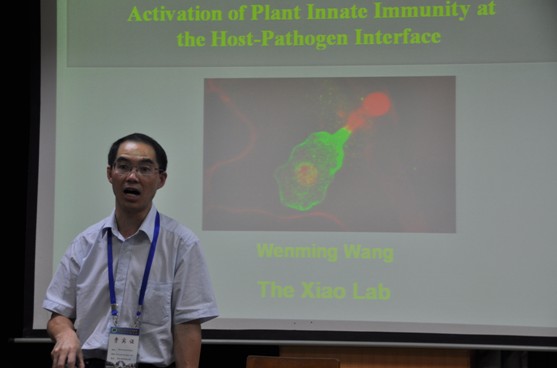 王跃进教授主持了报告会,报告会前,萧顺元教授和研究生进行了互动交流,回答了同学们的问题,并对大家提出殷切希望。随后,王文明博士作了题目为“Activation of Plant Innate Immunity at the Host-Pathogen Interface”的学术报告。报告中,王文明博士介绍了两个植物白粉病广谱抗病基因RPW8.1和RPW8.2在植物免疫中的作用及它们的分子机理的最新研究进展。RPW8.2-YFP蛋白可以特异地锚定到寄主-病原菌界面,从而促进过氧化氢高浓度地聚集到吸器复合体中,有效地抑制白粉菌生长。这是迄今为止,在植物病原菌和寄主互作过程中发现的第一个特异锚定到寄主-病原菌界面的抗病蛋白。这一发现为人们更清楚地洞悉植物和病原菌相互作用,打开了一扇崭新的大门。