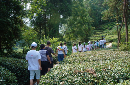 高山云雾出好茶。队员们一进茶园,便被美丽的景色深深吸引了。这里的茶园均是依山而建,踩着非常有特色的茶园小路,云雾缭绕着连绵起伏的茶山,雨露缠绵着鲜嫩翠绿的茶叶,还有山下独具特色的村民住宅,构成了一幅如梦似幻的山水画,令队员们流连忘返。