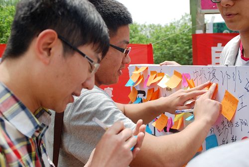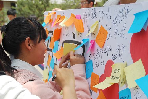 “雅安加油”“我们永远和你们在一起”……天气很热,但有很多员工停下匆忙的脚步写下自己的小小祝福。虽然话语不多,却表达了学子对雅安人民的真切的关心和祝愿:祝愿灾区人民能早日从地震的阴影中走出来,克服困难,重建家园。
