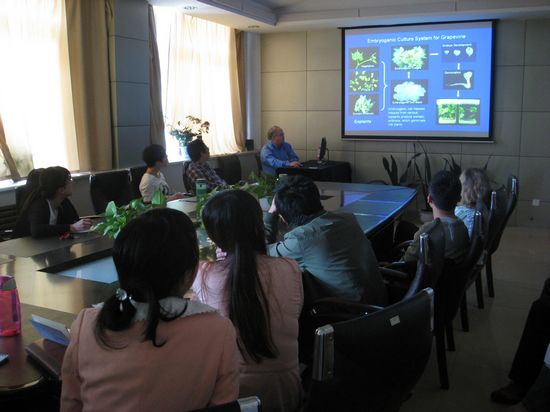 4月30日上午,Dennis Gray教授在公司二层会议室作了题为“Somatic Embryogenesis & Transformation in Grapevine”的学术报告。报告会由公司副经理王西平教授主持。葡萄胚状体发生方式是实现葡萄转基因育种的必要前提,Dennis Gray教授领导的团队致力于研究不同因素对葡萄胚状体途径再生效率及遗传转化效率的影响,以及将不同功能基因转入葡萄胚状体,获得改良的转基因植株。报告会上,Dennis Gray教授还和与会师生进行了广泛深入地交流。