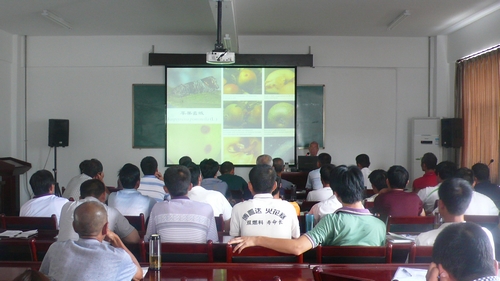此次培训主要涉及苹果生产形势、果园土肥水管理、苹果花果管理、果园腐烂病、早期落叶病防治、苹果整形修剪技术等方面。授课老师讲课气氛活跃,与果农即兴沟通,对果农提出的关于苹果栽培管理、病虫防治、整形修剪等方面的问题及时地给予指导。果农专心听讲,认真做好笔记。