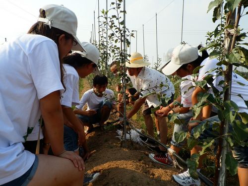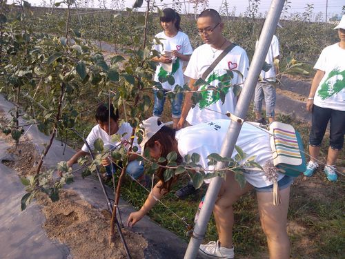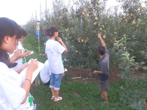 队员们实地探访了实践基地田间试验示范功能区、综合办公及科技培训服务中心区。从试验基地的苹果种质资源保留、苹果品种选育、苗木繁育、新技术示范等了解了试验基地管理和运行情况。并在基地老师的指导下,亲自参与果园生产实践。