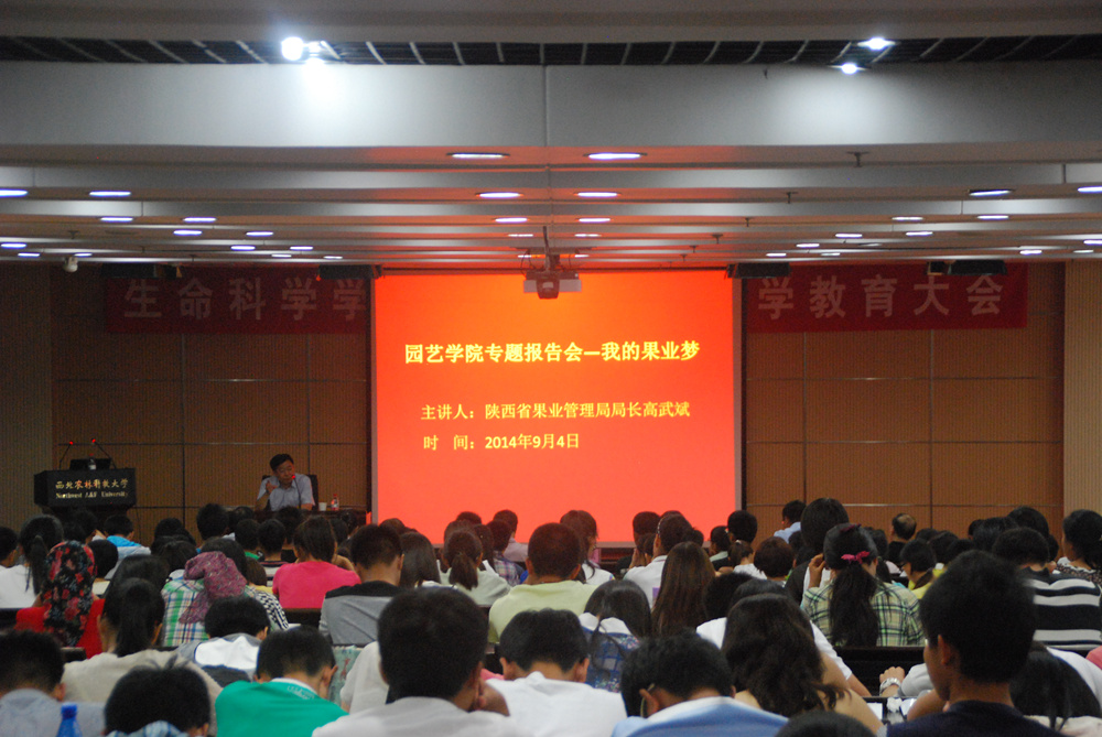 新闻背景:高武斌,男,汉族,1963年1月生,陕西延长人,1984年7月毕业于延安大学,毕业后在延安地区工商局工作;1997年8月任陕西省富县人民政府副县长;2002年8月任中共富县县委副书记;2006年6月至2007年6月任陕西洛川县人民政府代县长、县长;2007年6月任中共洛川县委书记;2013年2月至今任陕西省果业管理局局长。值此校庆之际,高武斌局长应邀前来为园艺学子作报告。