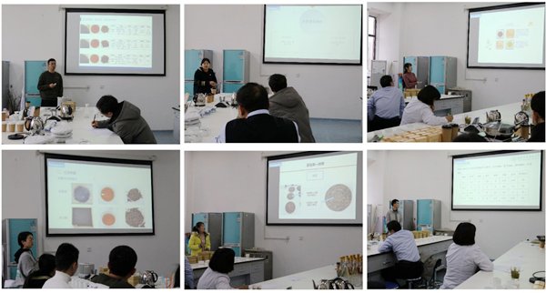 最后,举办了实习总结汇报会,并邀请公司金牌教师王俊儒教授,公司徐炎副经理、王国辉副书记,国家级园艺实验教学示范中心杜慧芳实验师,茶学教研室鲍露讲师、王伟东副教授、周杰讲师作为评委。会上,周天山副教授首先向大家介绍了本次实习的内容设置、实习组织形式和考核方式;接着徐炎副经理向大家介绍了《茶学毕业综合实习》课程改革的目的和举措,以及去年取得的经验,并指出打造一流本科课程、铸造实践“金课”的前进方向;徐清山讲师组织同学们以小组为单位进行了实习汇报。评委们对同学们制作的茶产品进行了感官审评,从而对每位同学的参与度、制作茶产品质量及汇报表现等方面进行了全面考核。