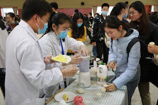 工作人员为员工做苹果奶昔