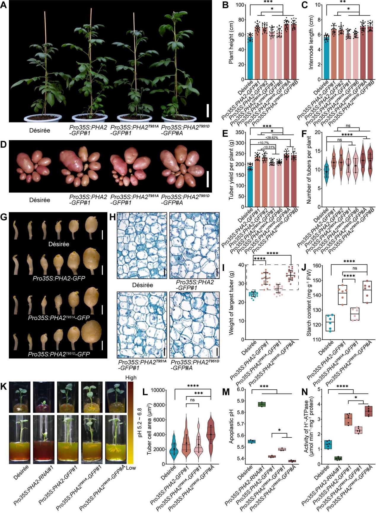 结合遗传证据,使用双转基因株系Co-IP分析和PM H+-ATPase活性测定以及一系列生化实验表明,StBRI1与PHA2的C末端相互作用,这抑制了PHA2 C端与PHA2中央环之间的分子内互作,从而减弱了PM H+-ATPase活性的自抑制,导致PHA2活性增加,并且PHA2可能处于StBRI1的下游发挥功能。进一步研究发现PHA2在马铃薯过表达PHA2可增加块茎重量、淀粉含量和细胞面积,而抑制PHA2表达则降低这些指标。将PHA2的Thr-951残基分别突变为模拟磷酸化形式(D)和非磷酸化形式(A),并构建了35S启动子驱动的PHA2-T951A和PHA2-T951D转基因马铃薯植株。发现,StBRI1和PHA2与细胞生长和质子泵的活性密切相关(图2)。