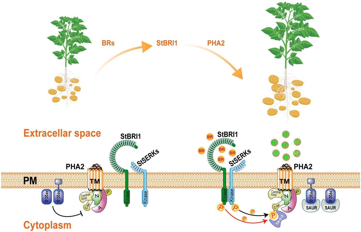 马铃薯( Solanum tuberosum )作为茄科茄属的一年生草本植物,是全球13亿人的主粮。在农业生产实践中,外源性应用油菜素内酯(BRs)已被证实能有效提升马铃薯的块茎数量以及单株产量,从而提高马铃薯总产量。然而,BR信号如何调控马铃薯块茎发育的分子机制依然不清楚。此外,植物中的PM H+-ATPase活性亦受到多种因素的影响。目前关于BR信号如何调节PM H+-ATPase磷酸化水平的具体成分知之甚少。也缺乏足够的证据来证实BRI1是否通过磷酸化修饰精确调节PM H+-ATPase的活性。
