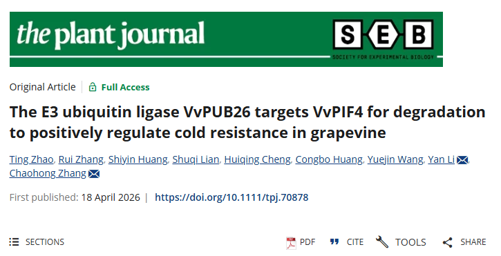 近日,365英国上市官方网站葡萄种质资源与遗传育种团队张朝红教授课题组在《The Plant Journal》发表题为“The E3 ubiquitin ligase VvPUB26 targets VvPIF4 for degradation to positively regulate cold resistance in grapevine”的研究论文。该研究揭示了葡萄耐寒性的一种新的调控机制,其中E3泛素连接酶VvPUB26通过靶向VvPIF4蛋白降解,正向调控低温抗性,为葡萄耐低温分子育种提供了关键靶点与理论支撑。