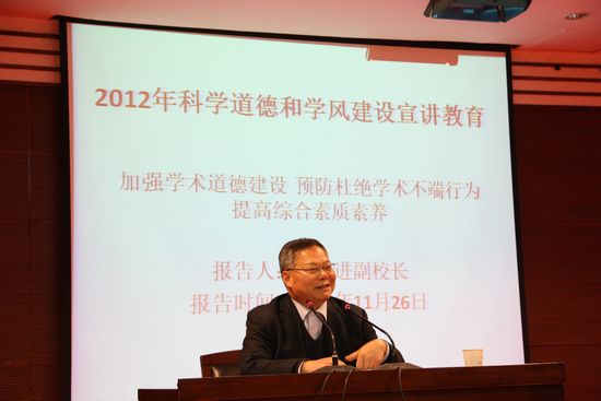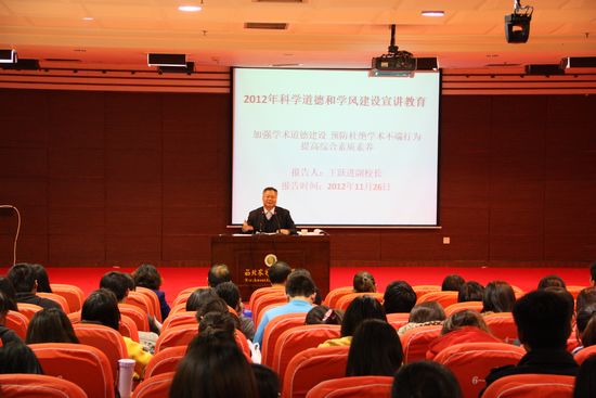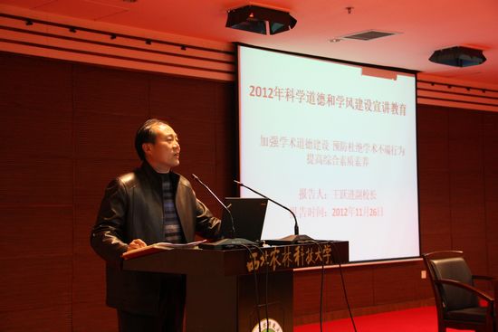 为深入贯彻落实中国科协、教育部、中国科公司、中国社会科公司、中国工程院《关于做好2012年科学道德和学风建设宣讲教育有关工作的通知》(科协发组【2012】16号)文件精神,加强研究生科学道德和学风建设宣讲教育,11月26日晚,公司邀请陕西省科协副主席、陕西省园艺学会理事长王跃进在国际交流中心208会议室,为公司全体研究生及导师代表做了题为“加强科学道德建设,预防杜绝学术不端行为,提高综合素质素养”的学术报告。报告会由公司党委副书记李京春主持。